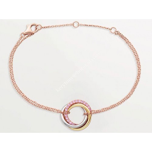 Product Name:Cartier Trinity Bracelet White Gold/Yellow God with Pink Diamonds Material:316L Titanium Steel + 18K Gold Plating Color:Pink Gold/Yellow Gold/White Gold