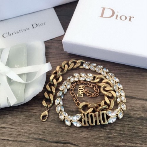 Dior DIOR Logo Charm Thick Chain Marquise Diamond Females Antique Brass White Crystal Faux Necklace