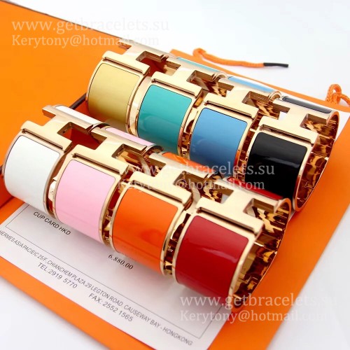 Product Name:Hermes Clic H Enamel Bracelet Extra Large With Gold/Silver/Pink Gold Plated Colors:White Gold/Yellow Gold/Pink Gold Enamel Colors:Black/White/Red/Orange/Pink Size:33mm Wide, 6cm Diameter Logo:Great Hermes Markings and Engravings